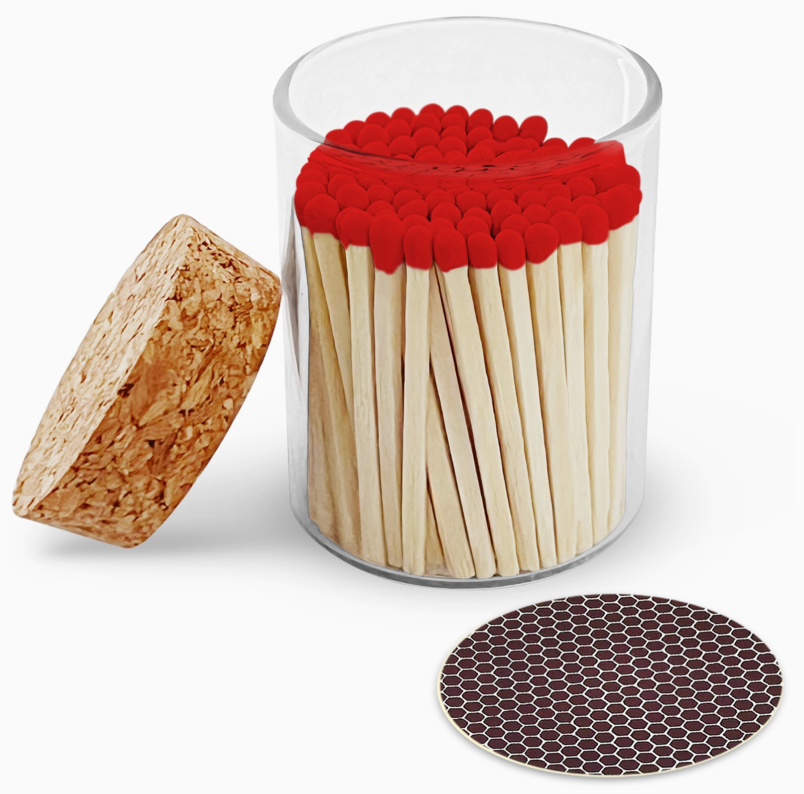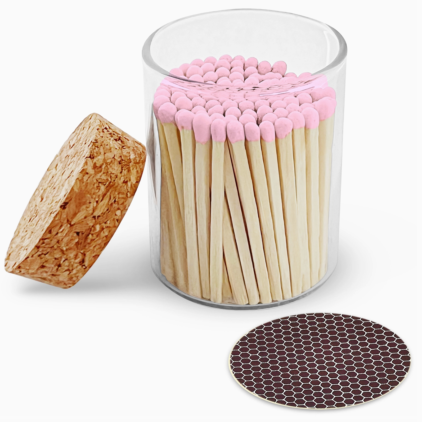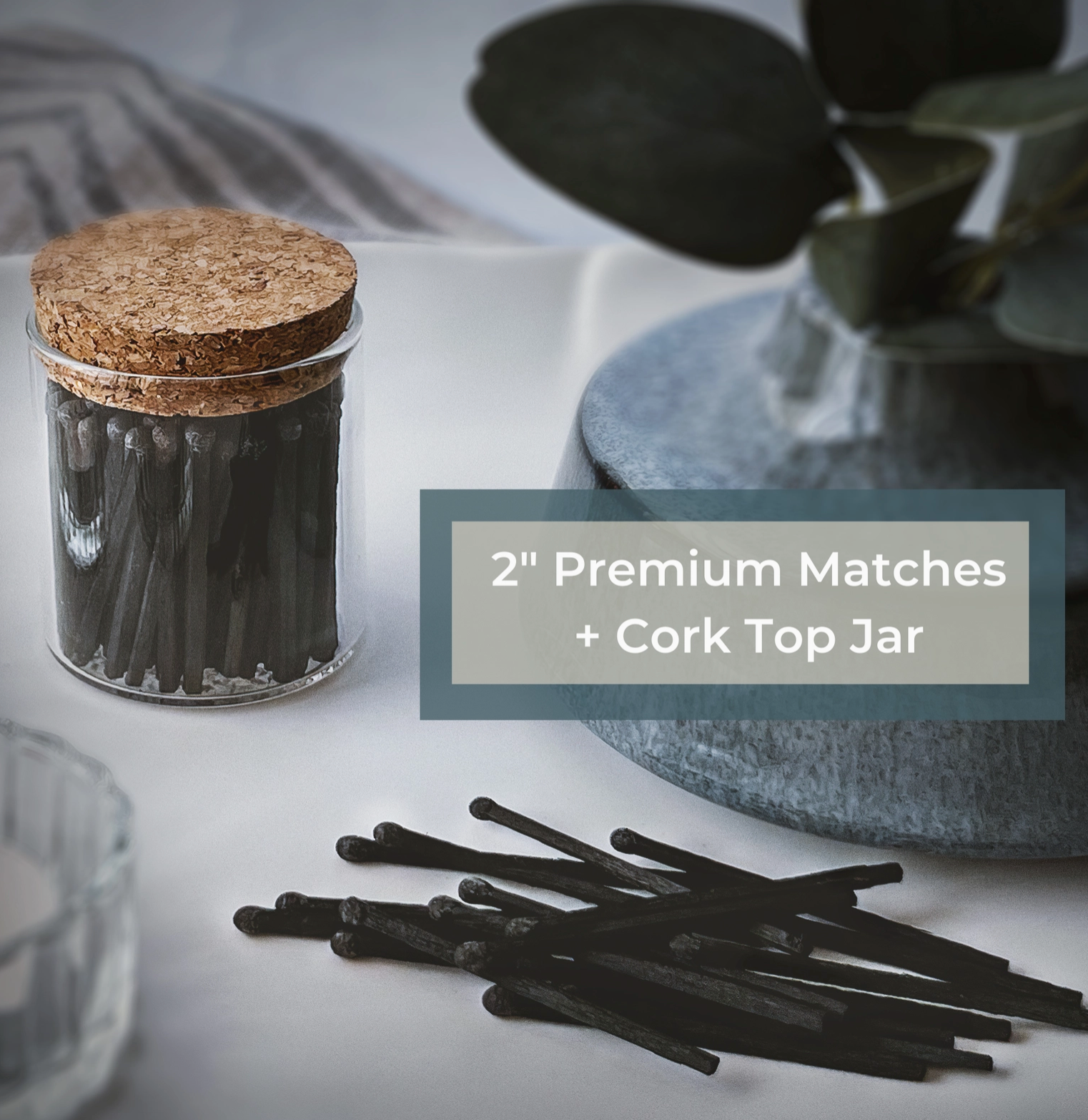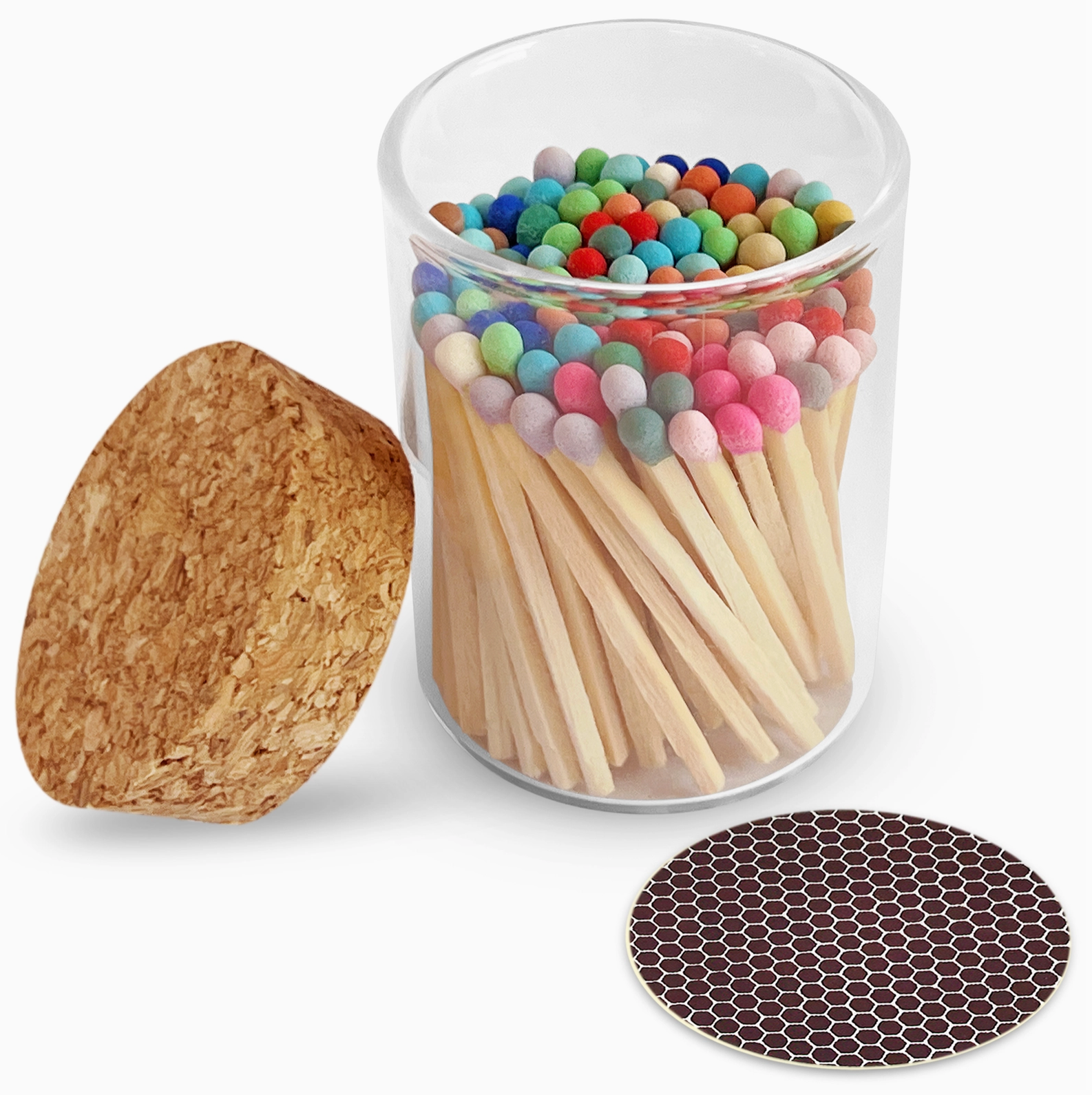 Each set includes 100 x 2" premium wooden matches in a glass jar with cork top, and a strike pad on the bottom of the jar. Matches available in a variety of colours to match your aesthetic