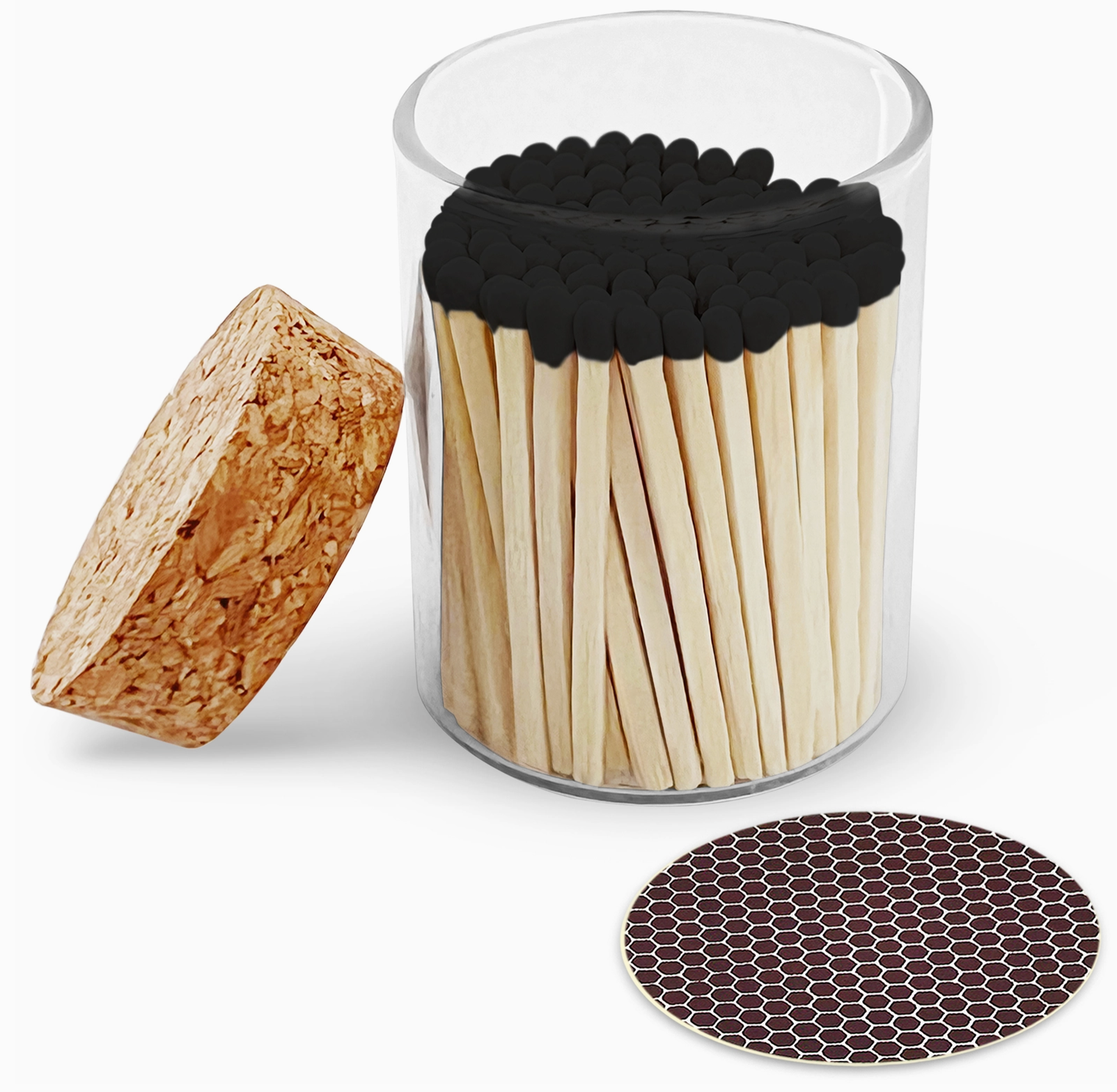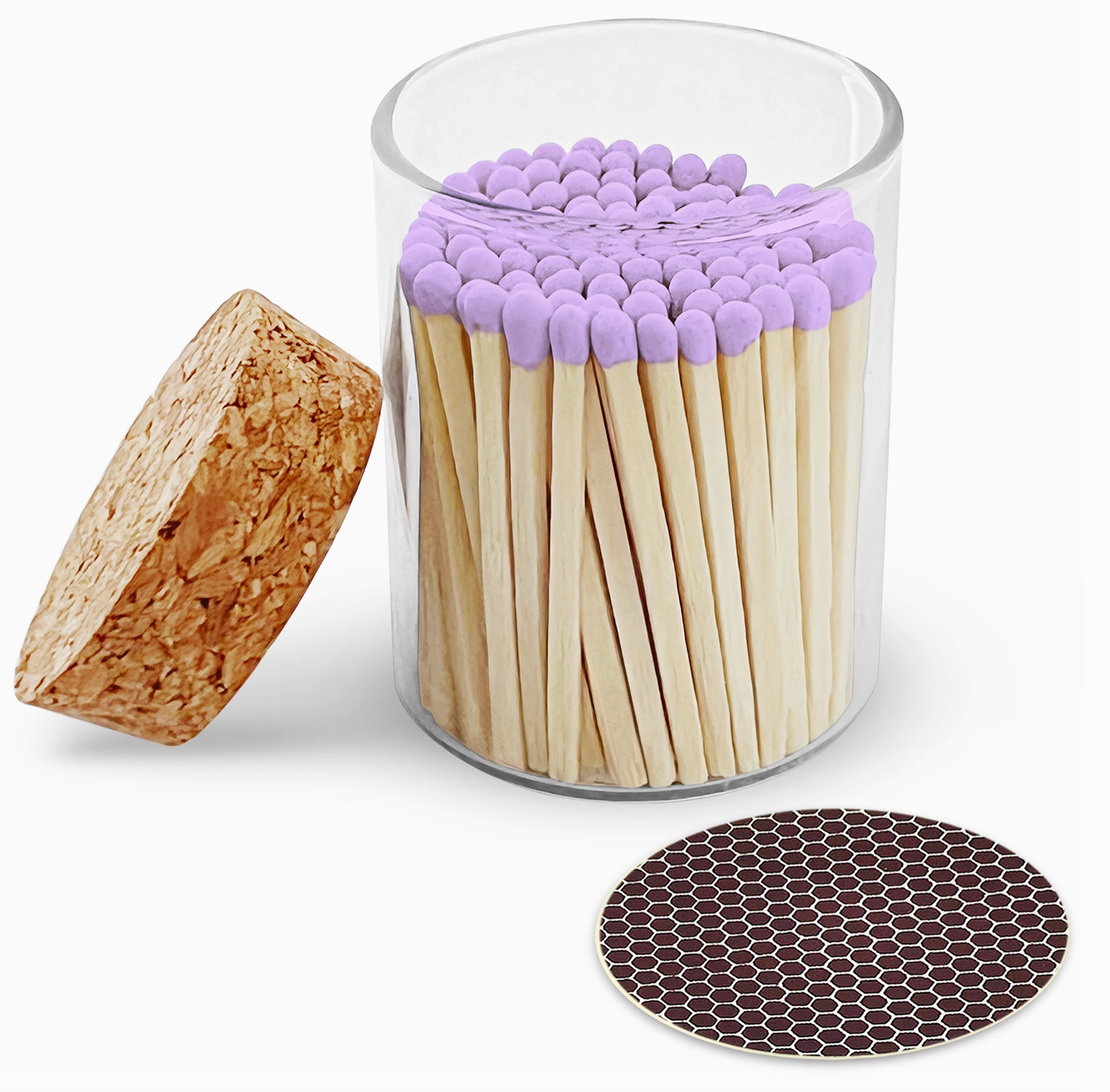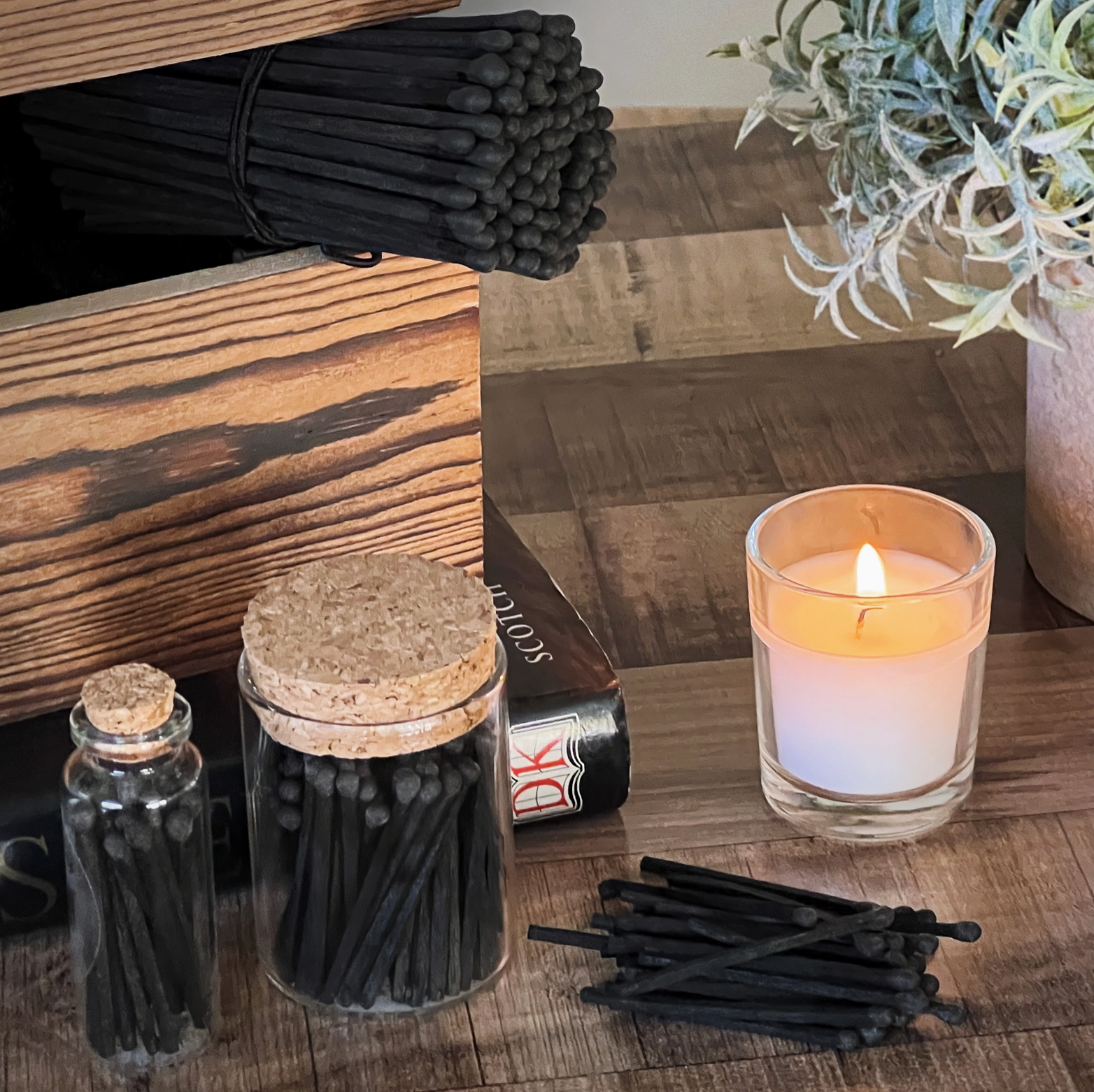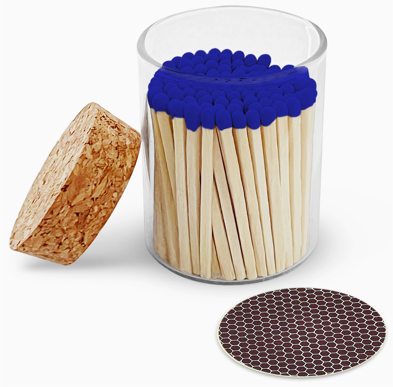 Each set includes 100 x 2" premium wooden matches in a glass jar with cork top, and a strike pad on the bottom of the jar. Matches available in a variety of colours to match your aesthetic