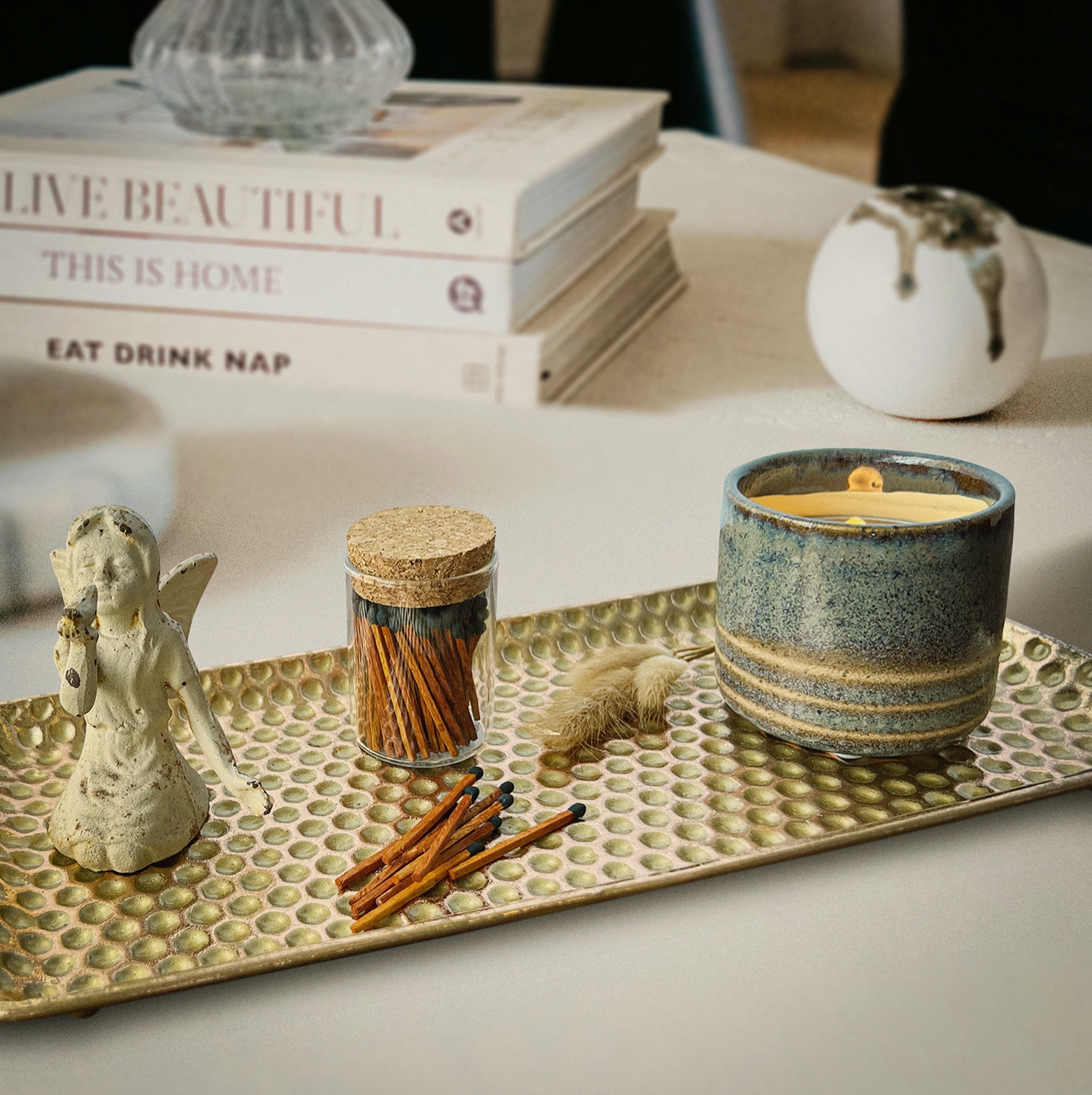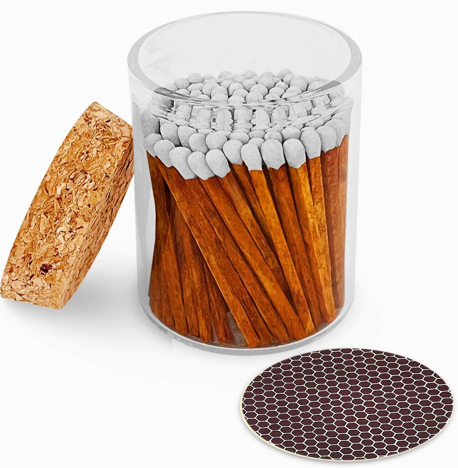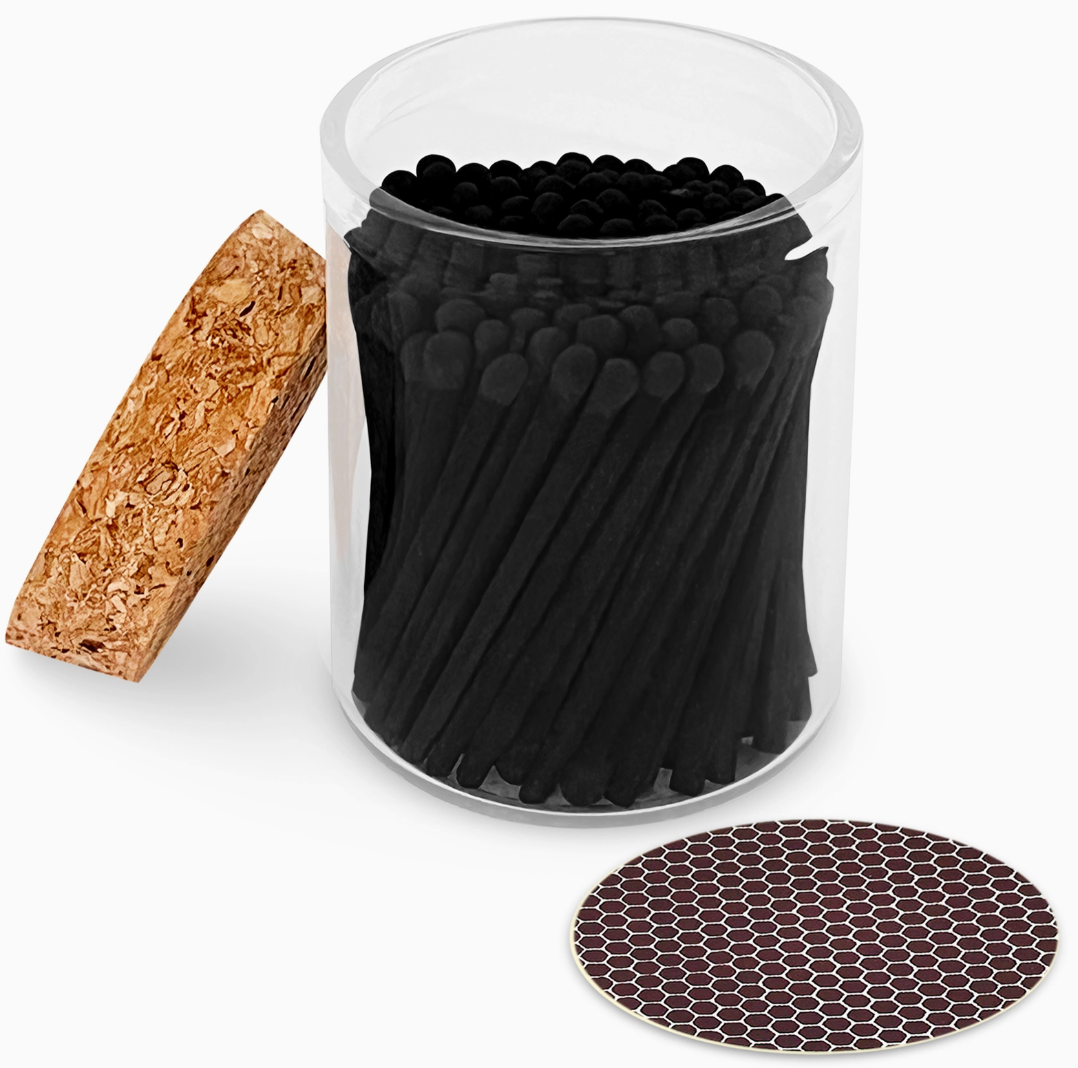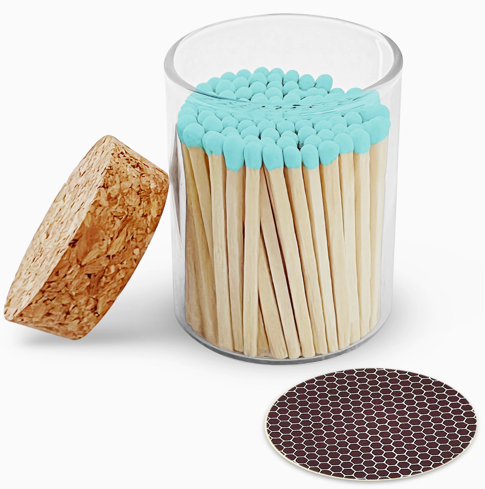 Each set includes 100 x 2" premium wooden matches in a glass jar with cork top, and a strike pad on the bottom of the jar. Matches available in a variety of colours to match your aesthetic