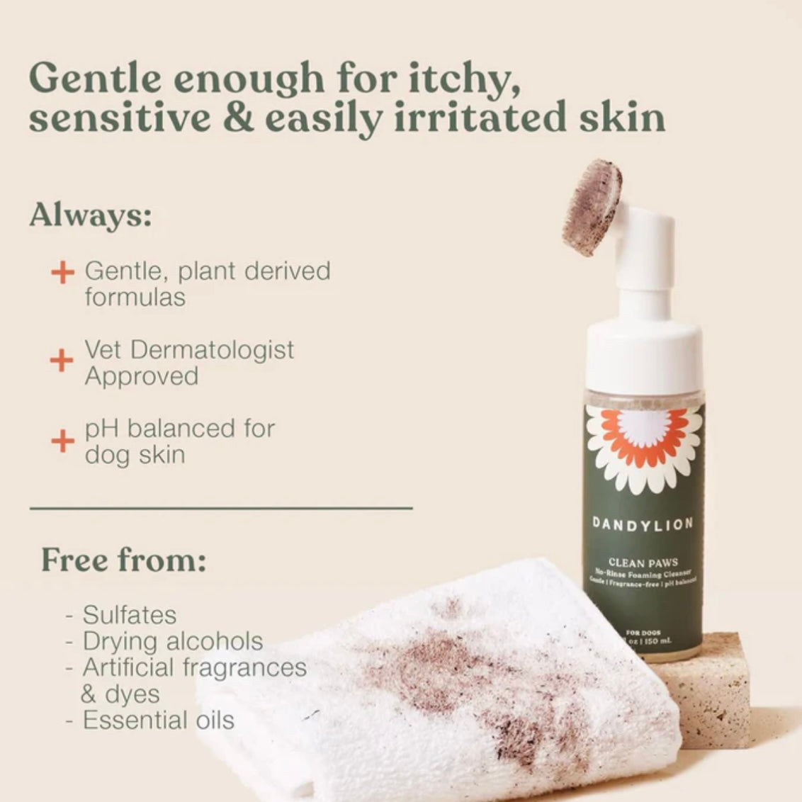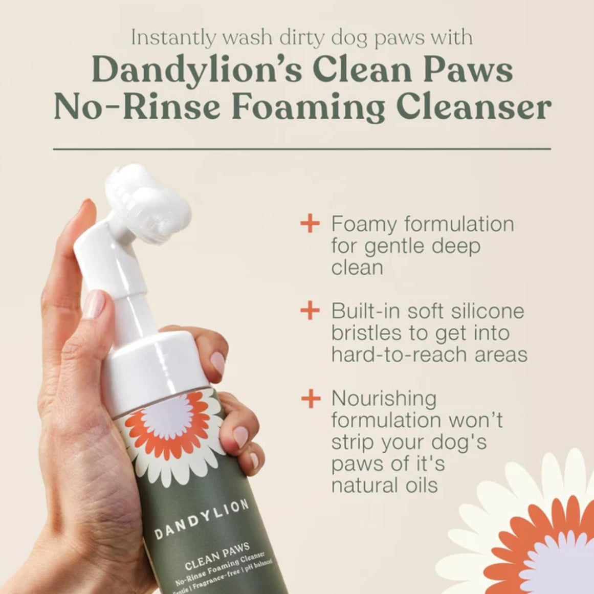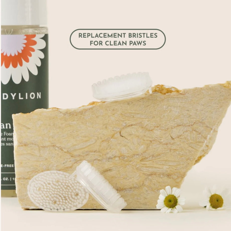 How to use: Remove the cap, and press down on nozzle to dispense foam onto the soft silicone bristles. Gently massage foam onto paws in circular motions, making sure to get in-between the paw pads. Wipe dry. No rinsing necessary. Use after every walk, or as often as needed. To clean silicone bristles, remove brush cover & rinse under warm water.