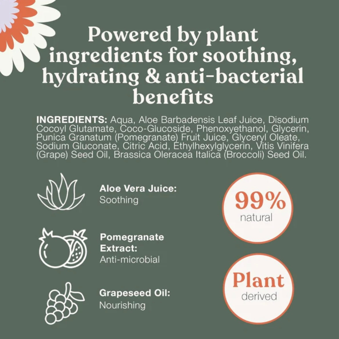 Ingredients: Aqua/Water/Eau, Aloe Barbadensis Leaf Juice*, Disodium Cocoyl Glutamate*, Coco-Glucoside*, Glycerin*, Glyceryl Oleate*, Punica Granatum (Pomegranate) Fruit Juice*, Brassica Oleracea Italica (Broccoli) Seed Oil*, Vitis Vinifera (Grape) Seed Oil*, Sodium Gluconate*, Citric Acid*, Phenoxyethanol, Ethylhexylglycerin
