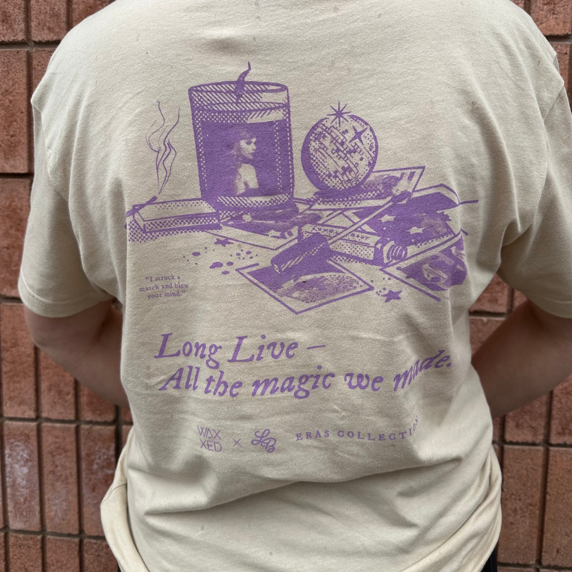 Front of shirt has custom 'Eras Collection' monogram design, back has custom illustration along with text "Long Live - All the magic we made."