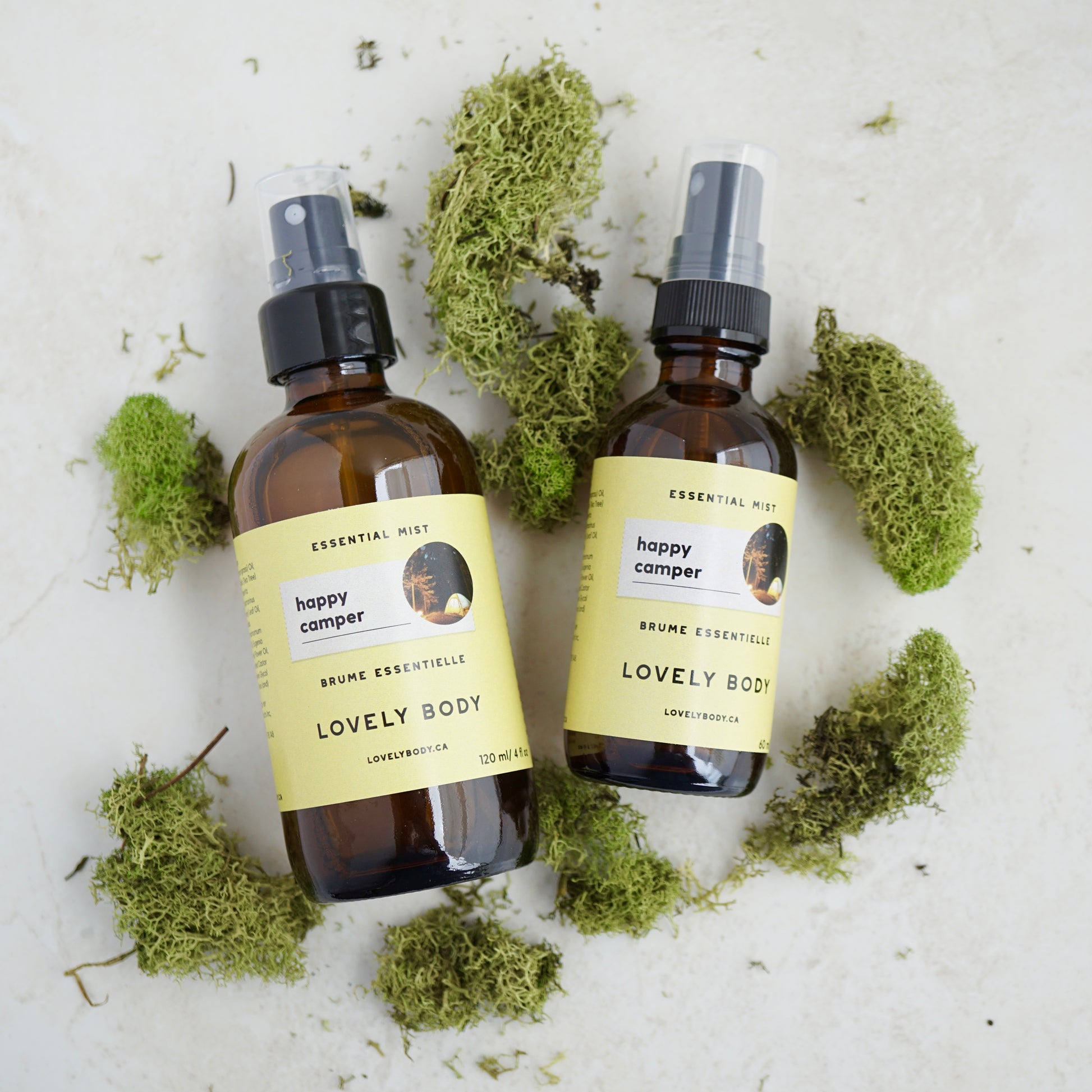- Happy Camper is bright and fresh, and great for spraying around socks/ankles etc.. while sitting around a bonfire, or enjoying outside!